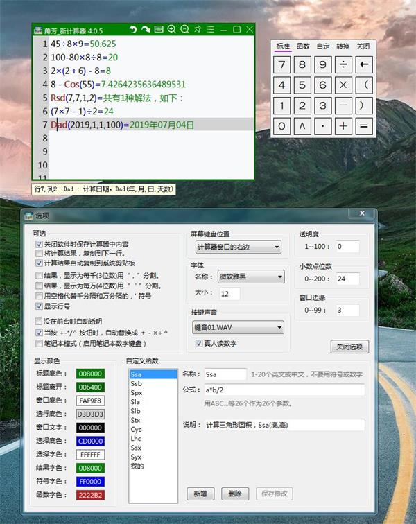 - 趣味与个性化计算:内置 24 点计算函数,为数学爱好者增添乐趣。用户还能自定义函数,以 ABC 等 26 个字母作为参数,设置计算三角形面积等特殊计算,简化重复操作,灵活适配个性化计算场景。