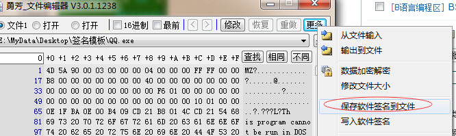 以后要给自己软件签名,只要打开【勇芳文件编辑器】,将你自己的软件文件拖到编辑器上,点击【更多】,然后点写入签名,就搞定