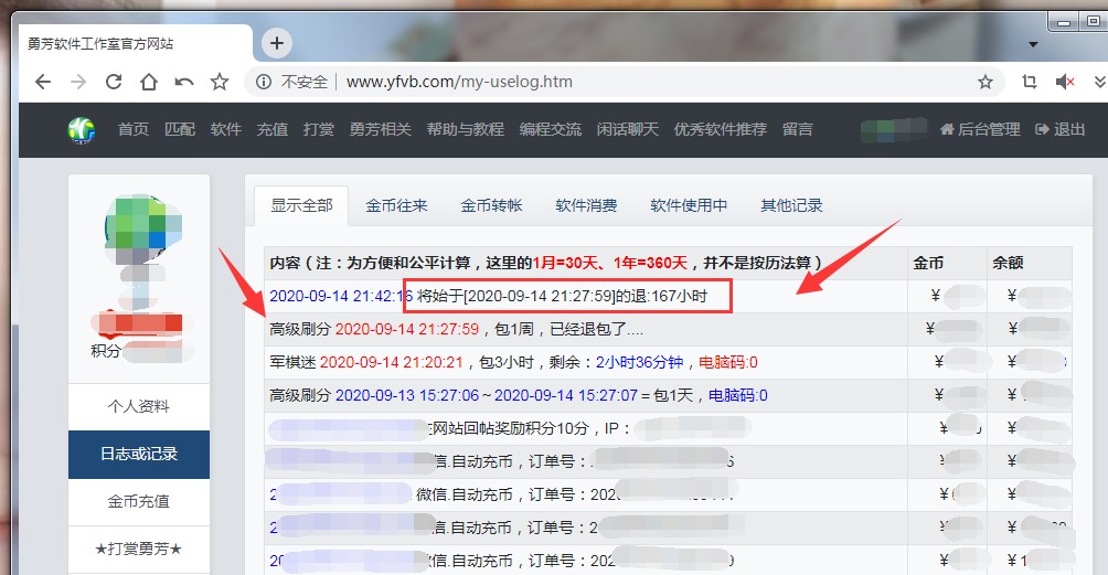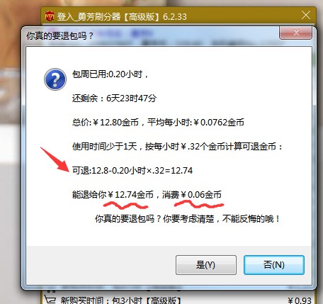 勇芳软件的收费购买后,都有退包功能,把购买的时间退掉,返还勇芳虚拟币,但不能退RMB。
