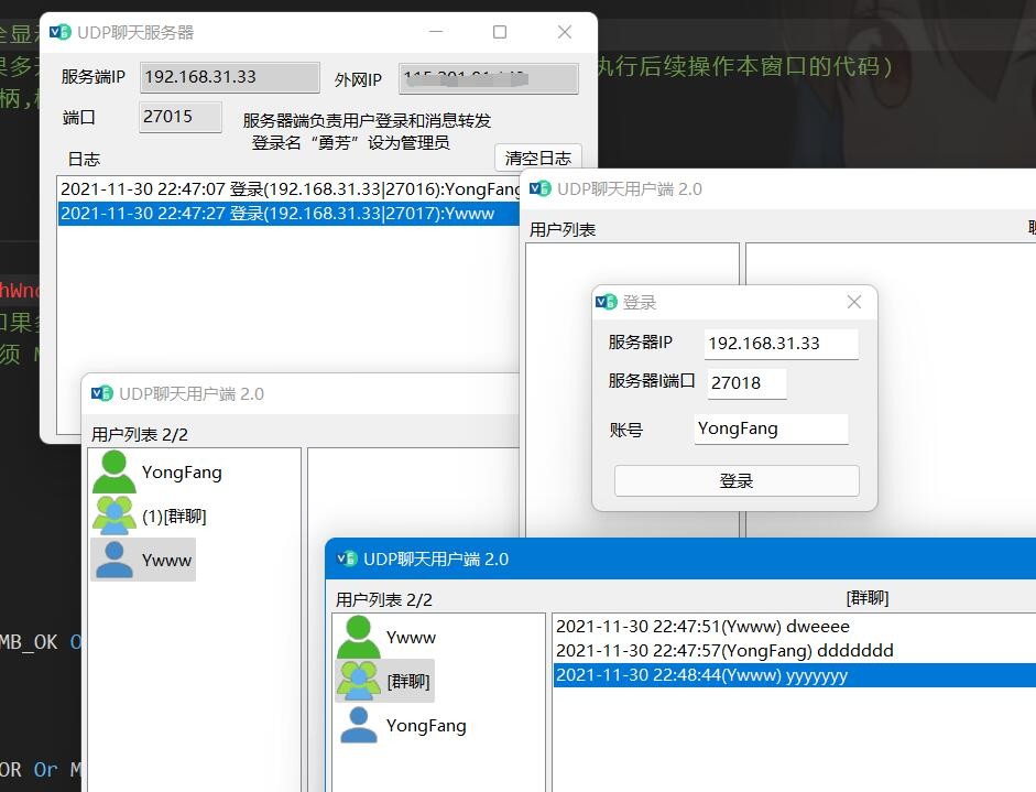 2,多用户聊天,QQ聊天的基本框架,服务器版放在服务器上,客户端开很多个,私聊和群里都可以。